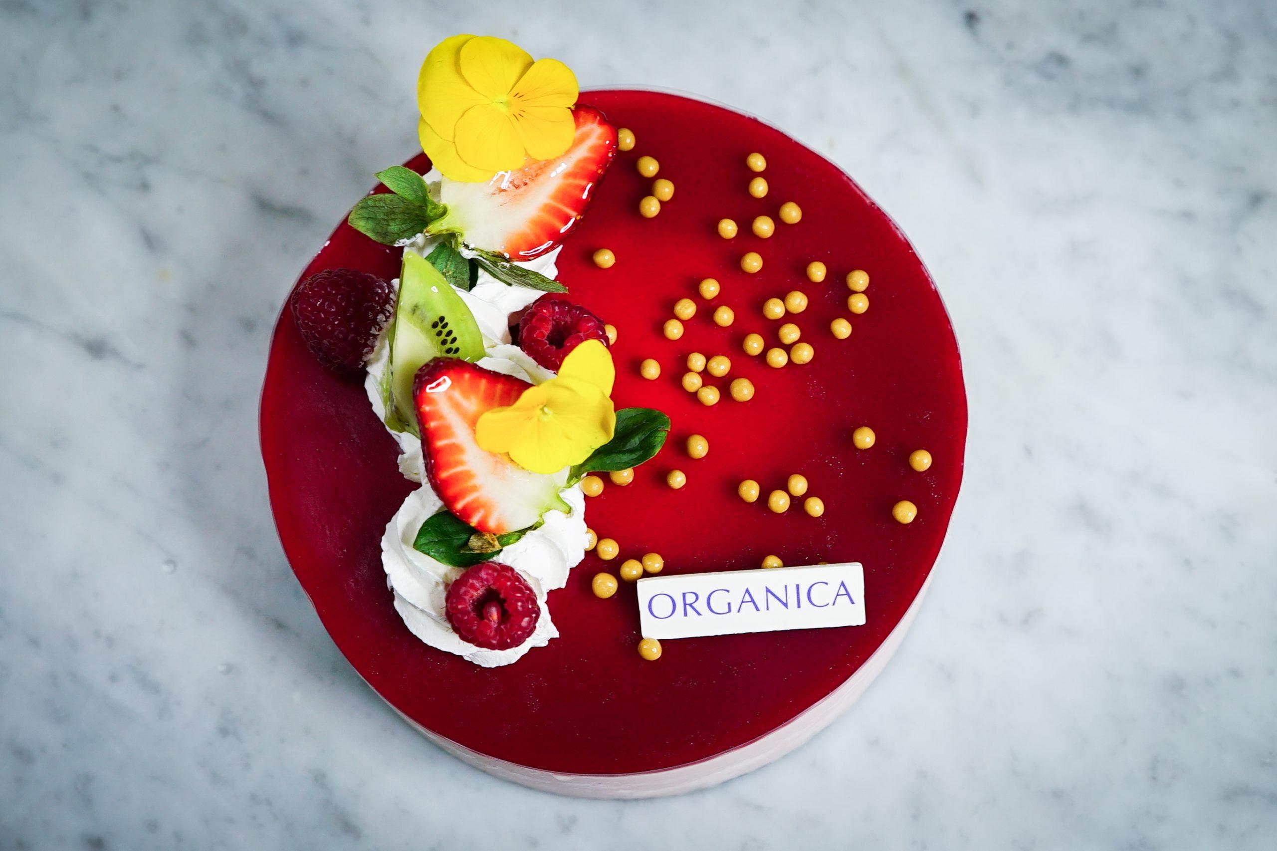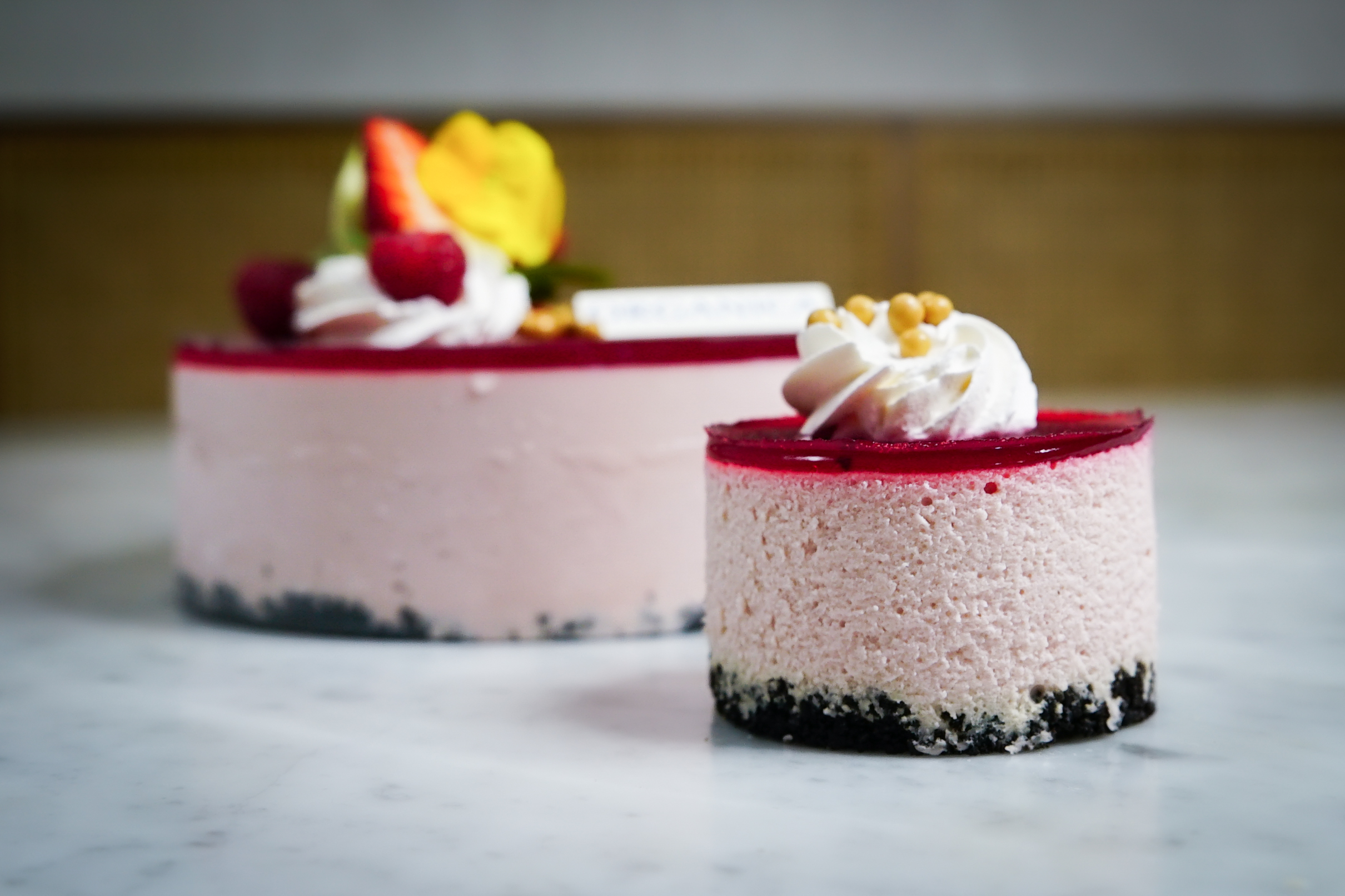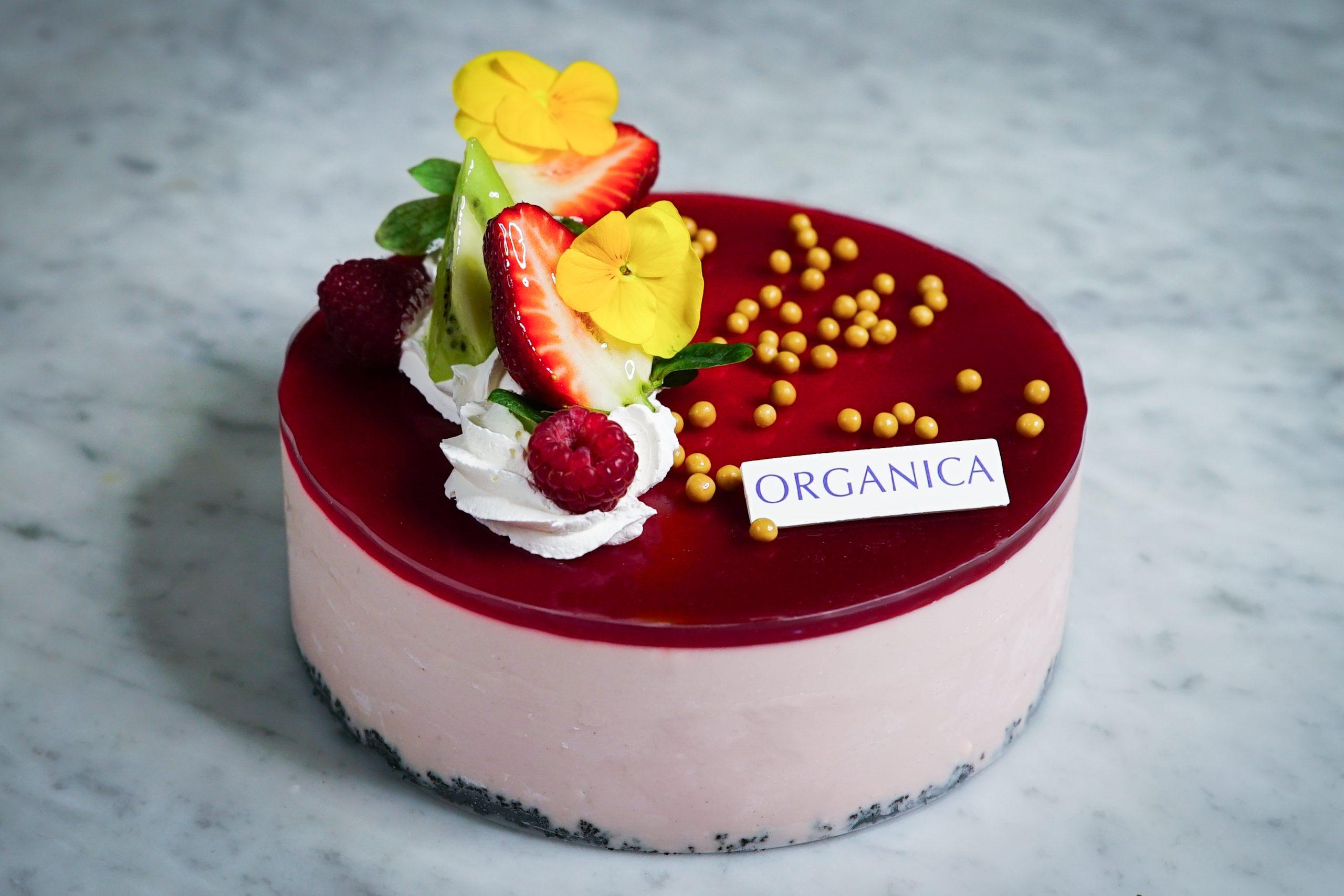 A fluffy cheesecake atop a biscuit base, topped with a layer of berry jelly, cream and fresh fruits