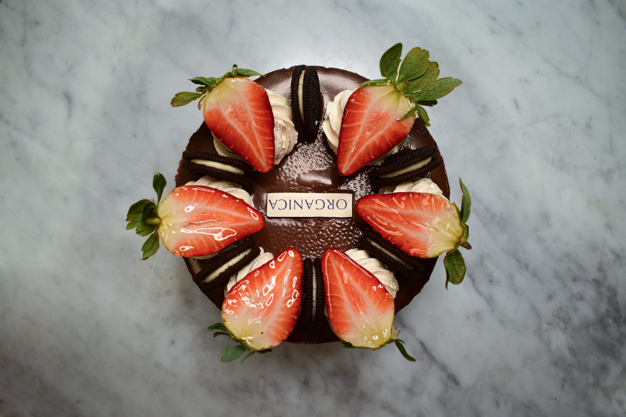 A fluffy cookie filled cheesecake atop a chocolate cookie base, topped with a layer of chocolate ganache